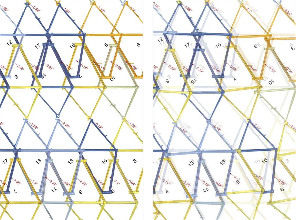 This system is capable of achieving much more precise alignment at connections, and because connection axes are oriented in parallel, the entire mesh of bike-frames could be deformed by maintaining alignment. This way, for example grid-shell structures could be designed.