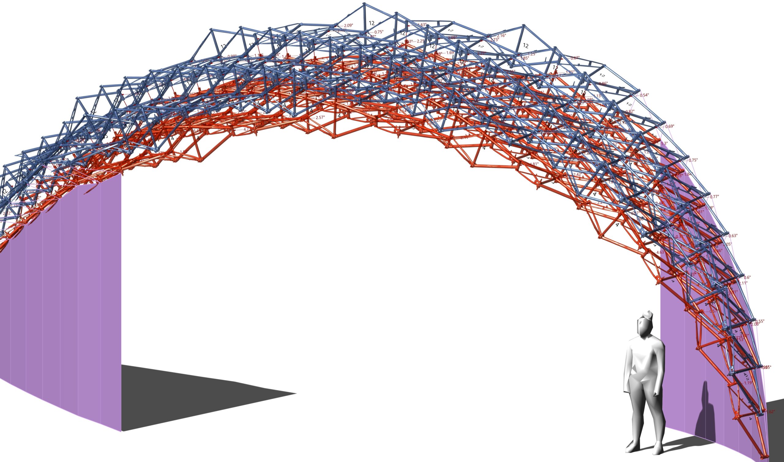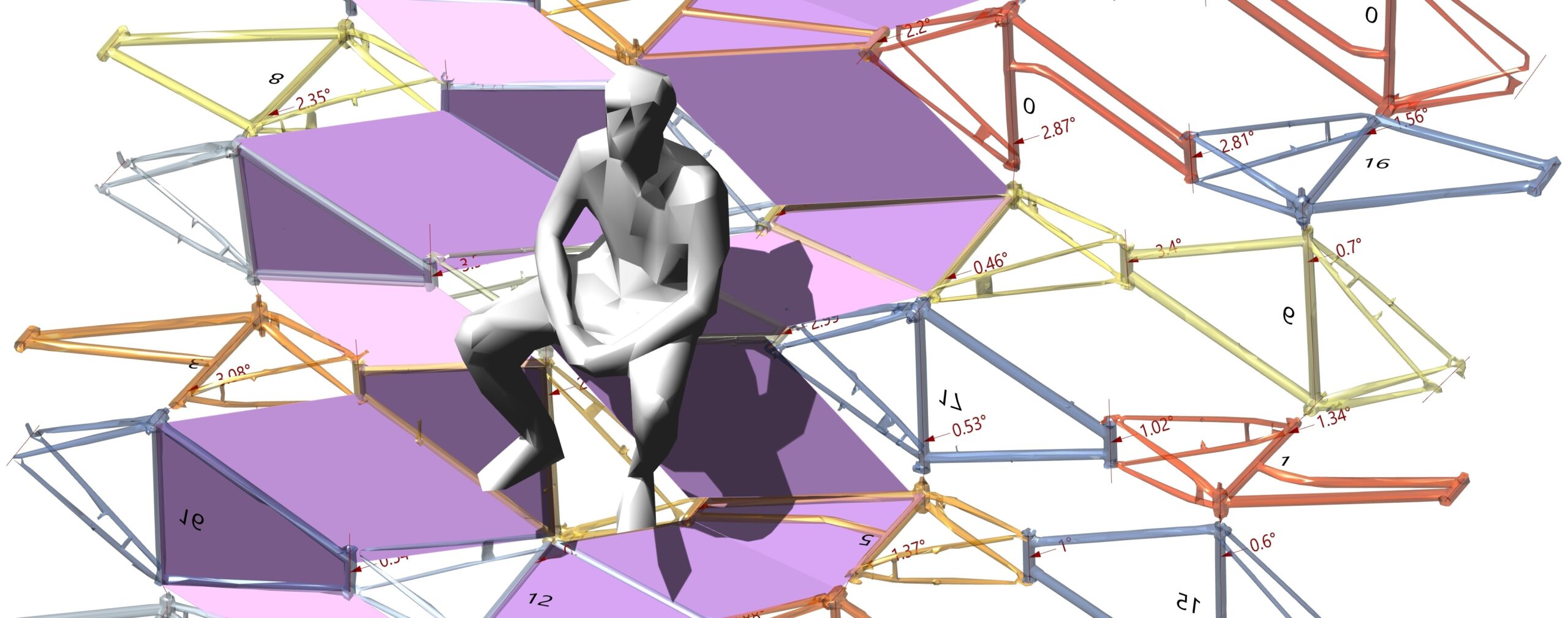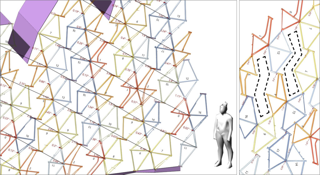 Pattern 1 allows for some global deformation. The threshold for bending is small, but when considering a large grid shell made of bike-frames, a slight curvature of the structure can be introduced to form a vaulted roof. Like in an initial study on a two-layered lattice-shell, the global form is a result of positioning smaller frames (red) at the bottom, and larger frames (blue) at the top layer. Dependent on the size differences, the curvature emerges naturally in the connection-alignment simulation.