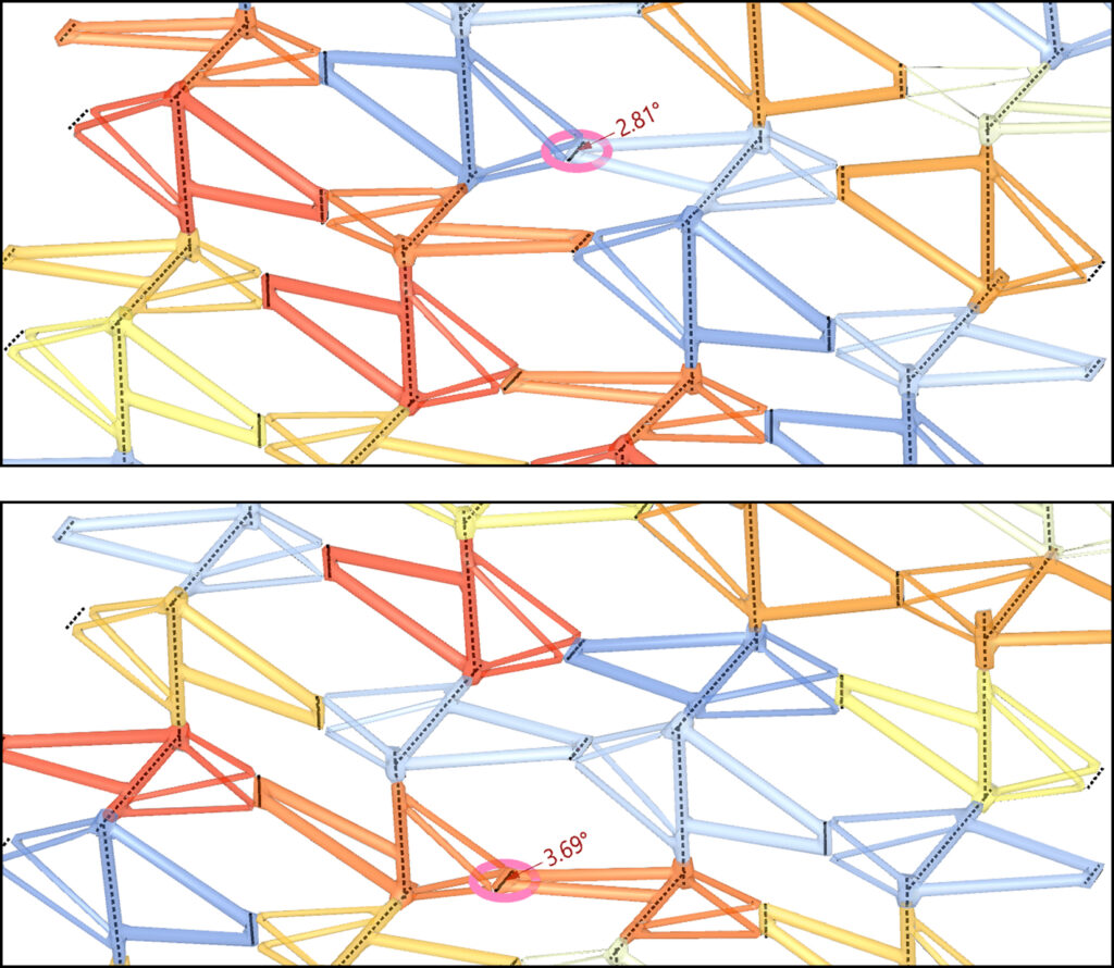 An analysis of two patterns with random part distributions showed that the largest deviations occur where frames with significantly different geometries are placed in close proximity. To address this problem, differences could be distributed evenly across the pattern, using its regularity. Both patterns are based on a periodic structure that combines linear sequences, or rows / columns into a lattice configuration. Local variations in part geometry disrupt the continuity of these sequences, leading to misalignments.