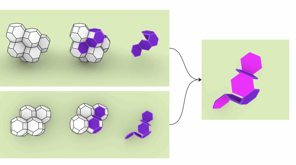 We began experimenting with these systems by extracting fragments—small modules made up of two to eight connected surfaces. These fragments became our new building blocks. Since they were originally part of a larger grid, they can be reassembled to fit back into that structure. By adding surface thickness, we avoided previous issues related to flatness and fragility.
