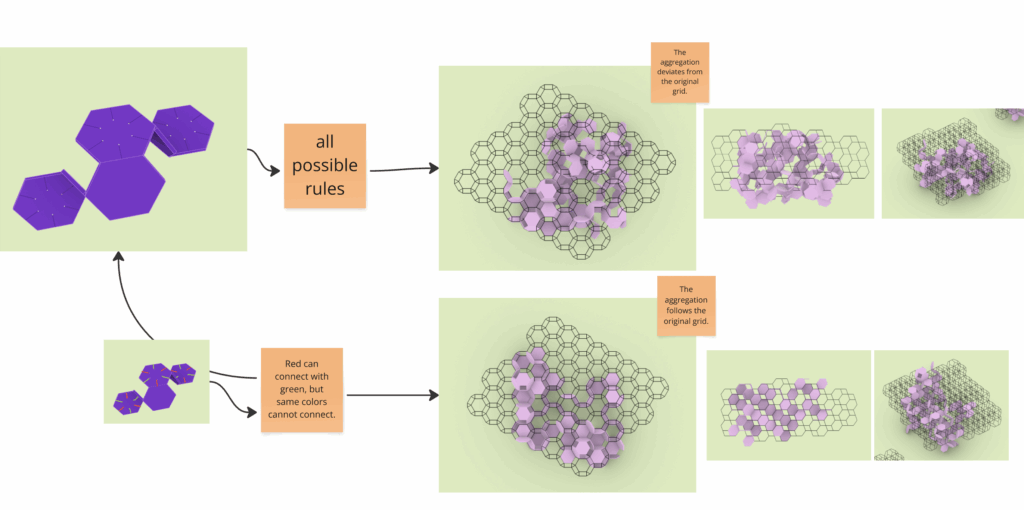 However, one condition was crucial: connections between these modules could only happen on the outside of the original solids. Attempting to connect surfaces that belonged inside the volume caused overlapping geometries and misalignments. This made it important to define clear rules for how and where parts could attach.