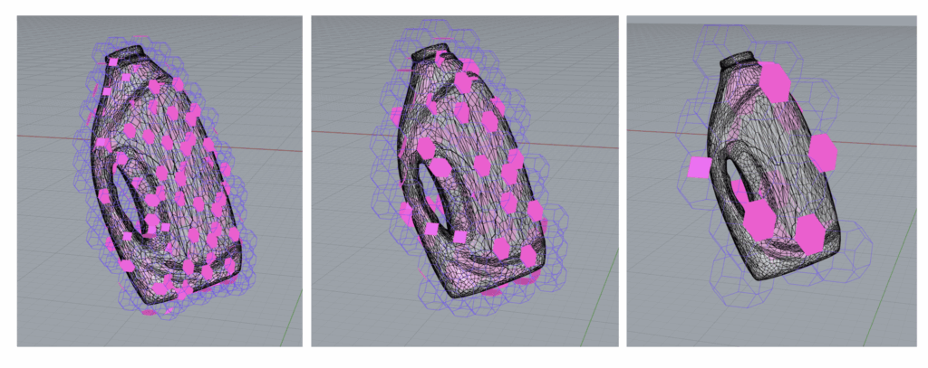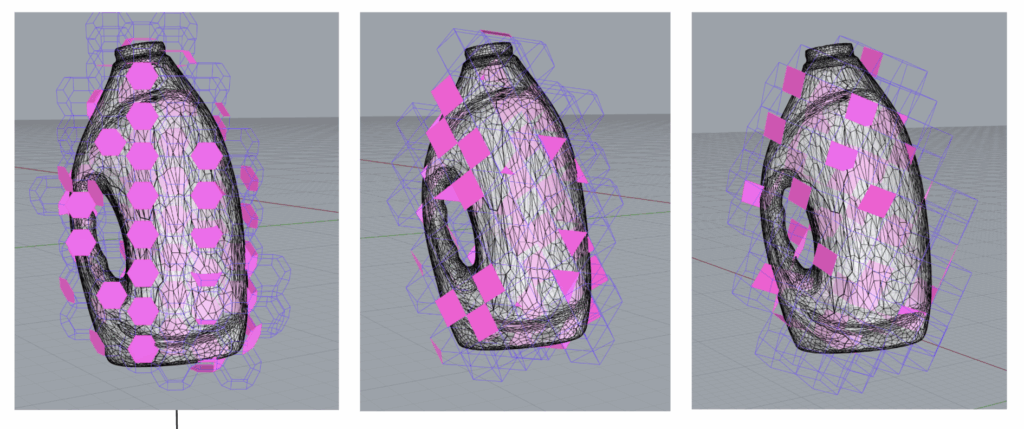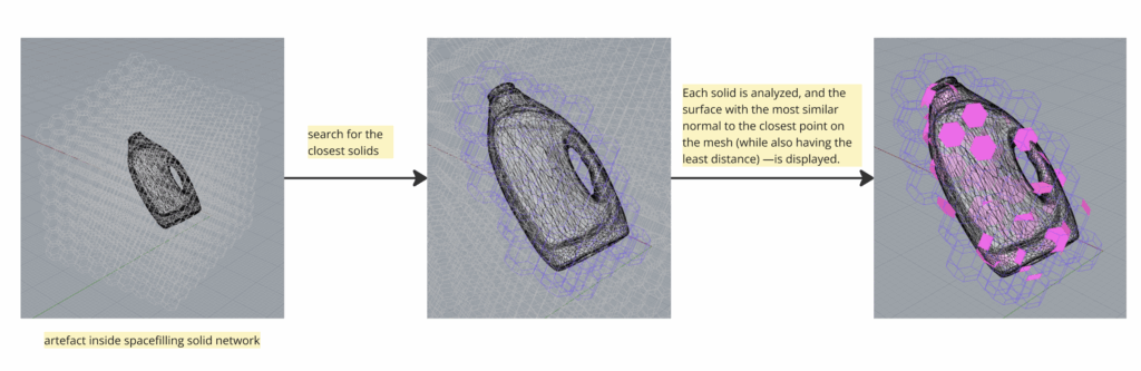 We chose a detergent bottle as our first test object. To explore the approximation process, we developed a script in Grasshopper. The script generated a series of space-filling grids with scalable parameters and allowed us to place the artefact within them. From there, it analyzed each solid in the grid to find the surface most closely aligned with the artefact’s geometry. It identified surfaces with similar normal directions and minimal distance to the artefact’s mesh.