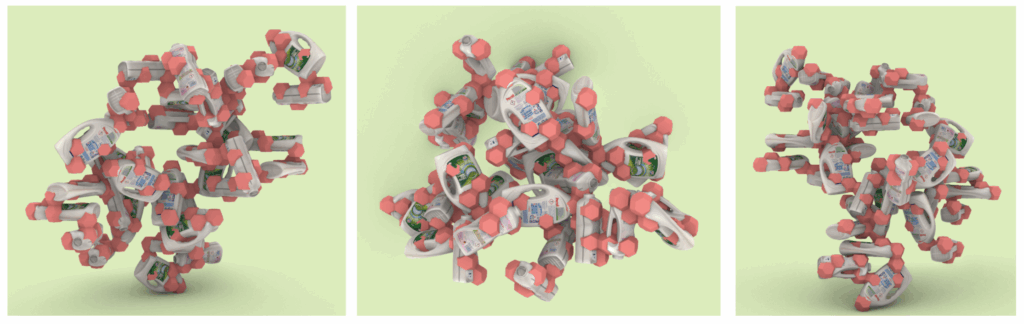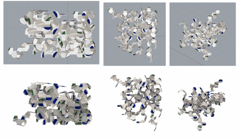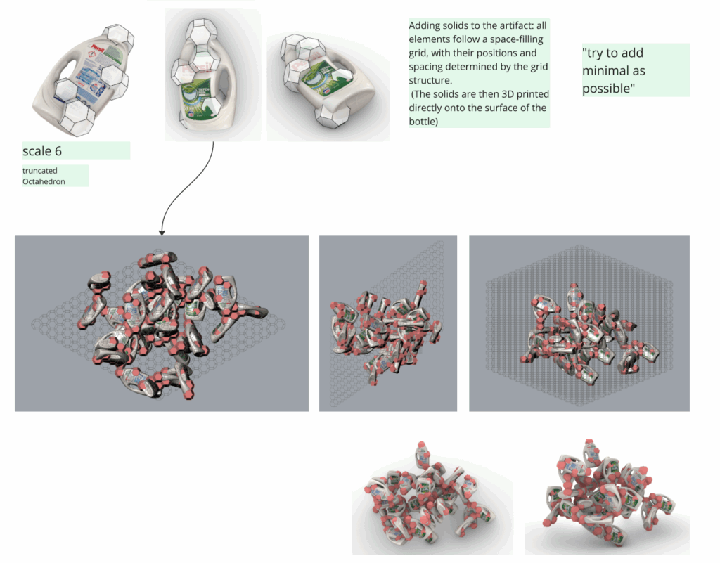 This “part” was then digitally cut out of the bottle and treated as a discrete module—complete with its four connection surfaces. When placed into Wasp, this part could now be aggregated into larger, stochastic structures. A small piece of waste was now embedded into a system of repeatable geometry. It no longer existed as a discarded object, but as an active part of a new geometric logic.