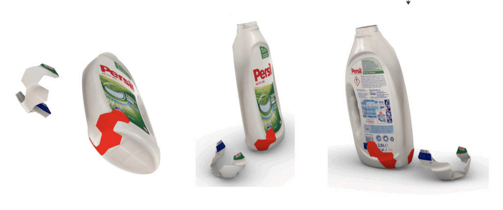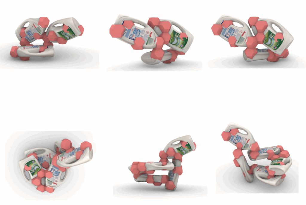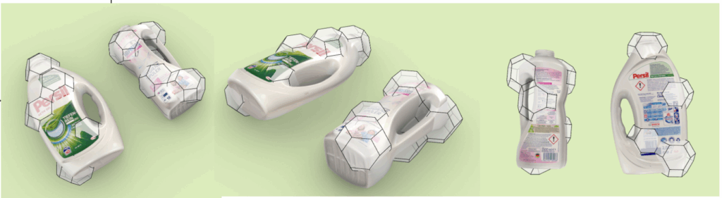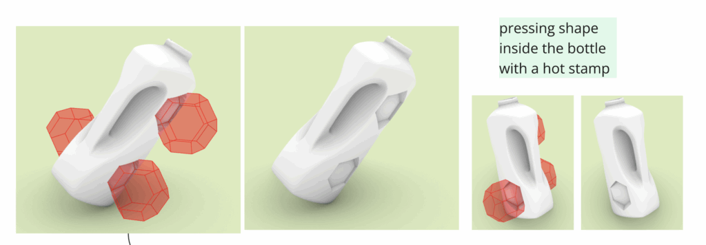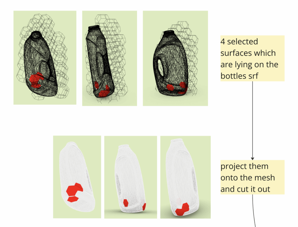 Despite these limitations, we carried out a first proof-of-concept. We selected four surfaces from the detergent bottle that best matched the space-filling grid and projected them onto the bottle’s mesh. The resulting space between these four faces was closed with freely drawn surfaces, forming a complete part.