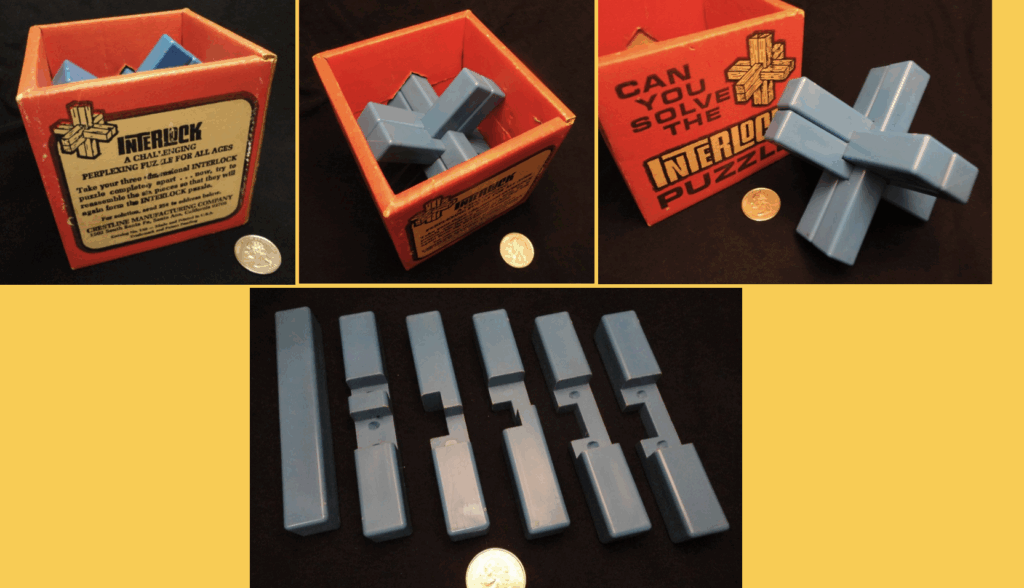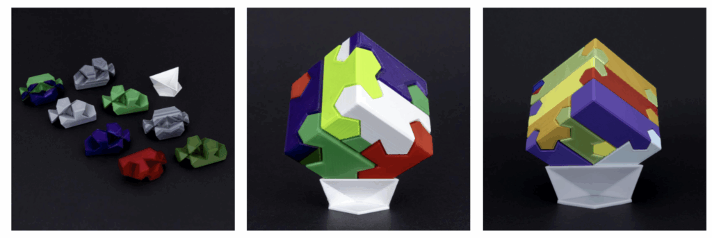 - Traditional 3D interlocking puzzles, like the 6-piece burr