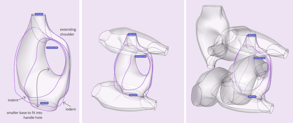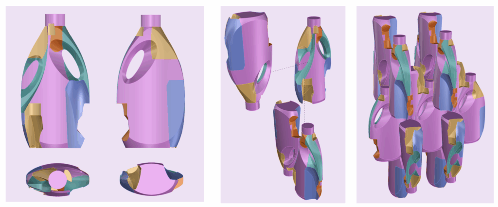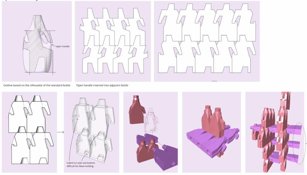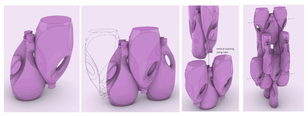 Keeping a curved bottle shape but “printing” part of one bottle’s shape into another. The handles serve for horizontal locking; caps for vertical stacking.
